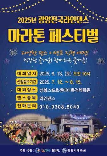 [중앙뉴스라인, 우제헌기자] 광양시는 오는 9월 13일 성황스포츠센터에서 ‘2025 광양전국라인댄스 마라톤 페스티벌’을 개최한다고 밝혔다.