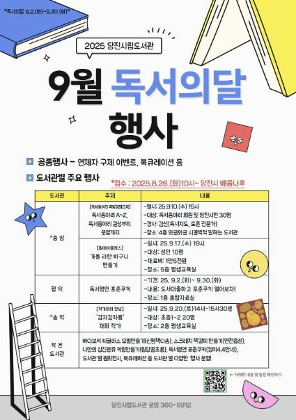 [중앙뉴스라인, 우제헌기자] 당진시립도서관은 9월 ‘독서의 달’을 맞아, 한 달간 시립도서관 15개소(공공도서관 3개소, 작은도서관 12개소)에서 다양한 문화행사를 운영한다.