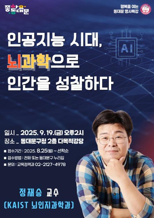이번 명사특강은 인공지능·뇌과학·미래 사회에 관심이 있는 구민과 직원 누구나 참여할 수 있으며, 참여를 원할 경우 동대문구청 누리집을 통한 온라인 신청 또는 전화(02-2127-4978)로 사전 신청하면 된다.