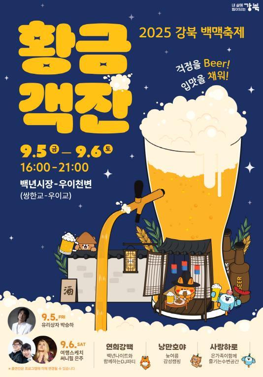 [중앙뉴스라인, 우제헌기자] 서울 강북구는 오는 9월 5일과 6일 이틀간 오후 4시부터 9시까지 백년시장과 우이천변(쌍한교~우이교) 일대에서 ‘2025 강북 백맥축제’를 개최한다고 밝혔다.