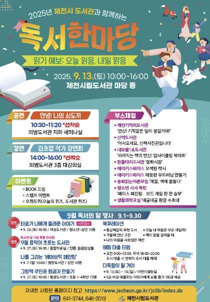 [중앙뉴스라인, 우제헌기자] 제천시립도서관은 9월 ‘독서의 달’을 맞아 제천시립도서관(시립·여성·봉양)에서 전 세대를 아우르는 다채로운 문화 행사를 운영한다.