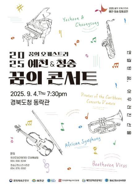 연주 프로그램은 예천과 청송 단원들이 각각 준비한 ▲이문세 메들리 ▲드보르작 교향곡 '신세계로부터' 4악장 등 각 3곡의 무대에 이어, 연합 오케스트라의 협연으로 ▲Concert D’amore ▲영화 '캐리비안의 해적' OST 메들리가 펼쳐지며 관객들에게 다채로운 감동을 선사할 예정이다.