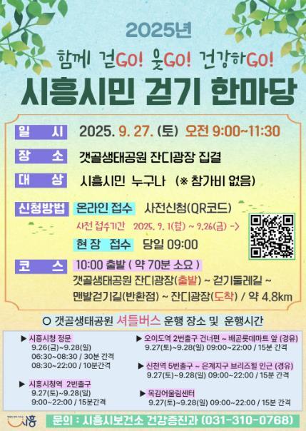 [중앙뉴스라인, 우제헌기자] 시흥시는 시민의 건강한 생활 습관 확산과 활기찬 지역 공동체 조성을 위해 오는 9월 27일 오전 9시, 갯골생태공원 잔디광장에서 ‘2025년 제3회 시흥시민 걷기 한마당’을 개최한다.