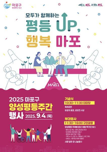 [중앙뉴스라인, 우제헌기자] 마포구는 9월 1일부터 7일까지 이어지는 양성평등주간을 맞아 양성평등 문화 확산과 인식 제고를 위해 9월 4일 목요일, 마포구청 대강당과 구민광장에서 ‘제30회 양성평등주간 기념행사’를 개최한다.