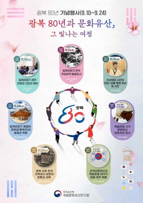 국가유산청 국립문화유산연구원은 광복 80주년을 맞아, 우리 문화유산을 소재로 한 다양한 행사를 통해 국민과 함께 광복의 의미를 새롭게 조명할 수 있기를 기대하며, 앞으로도 문화유산의 연구과 보존을 통해 우리 역사를 바로 세우고 지켜나가는 데 지속적으로 노력해 나갈 예정이다.