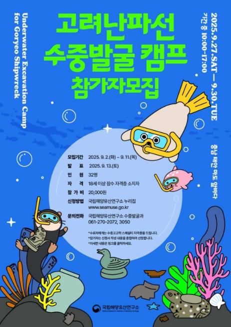 [중앙뉴스라인, 우제헌기자] 국가유산청 국립해양유산연구소는 오는 9월 27일부터 30일까지 일반 국민들이 수중유산 조사를 직접 체험해볼 수 있는 '고려난파선 수중발굴 캠프'를 운영한다. 지금까지는 수중발굴 전문가들만 경험해 볼 수 있었던 신비롭고도 역사적인 바다가 이제는 국민에게 활짝 열리는 것이다.