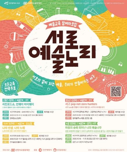(재)인천서구문화재단 문화예술교육지원센터는 ‘2025 기초단위 문화예술교육 활성화 지원사업’의 일환으로 지역특화 문화예술교육 프로그램 '서로-예술노리'의 참여자를 오는 9월 1일부터 9월 28일까지 모집한다. 이번 프로그램은 인천 서구 주민을 대상으로 참여자 모집하여 10월부터 11월까지 약 두 달간 권역별 지역 거점에서 전액 무료로 운영될 예정이다.