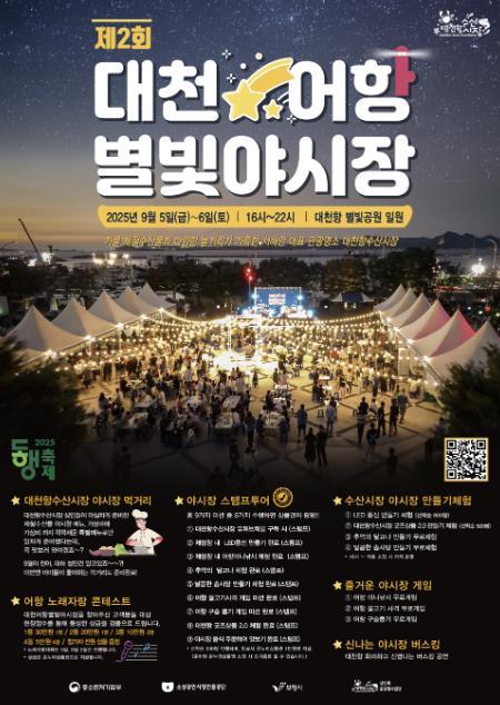 야시장의 분위기를 한층 돋워줄 버스킹 공연도 이어진다. 9월 5일에는 가수 이성우, 선요밴드, 최대성이 무대에 오르며, 6일에는 김희나, 유리성대, 서비결이 출연해 다채로운 장르의 음악을 선보일 예정이다. 낮에는 수산시장, 밤에는 별빛야시장으로 대천항이 낮과 밤 모두 활기를 띠는 명소로 자리잡을 것으로 기대된다.