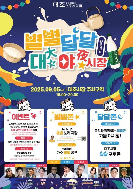대조시장은 이번 야시장에서 자체 브랜드 ‘대막’을 발전시켜 ‘대(大)야(夜) 큰 밤’이라는 콘셉트로 막걸릿잔 세트 증정, 영수증 이벤트, 사회관계망서비스(SNS) 인증사진 경품 등 이벤트를 선보인다.