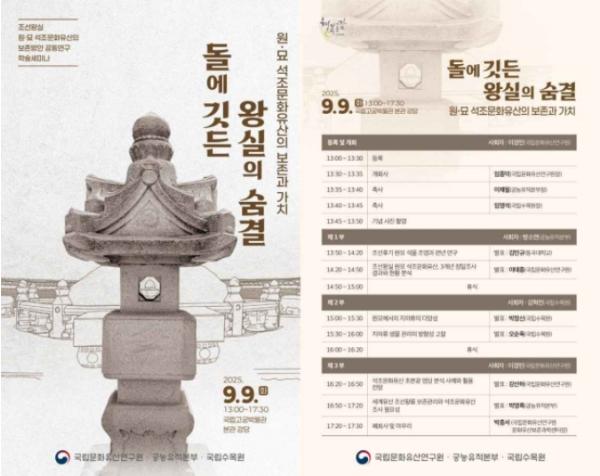[중앙뉴스라인, 우제헌기자] 국가유산청 국립문화유산연구원과 궁능유적본부는 산림청 국립수목원과 함께 오는 9월 9일 오후 1시 국립고궁박물관 본관 강당(서울 종로구)에서 ‘돌에 깃든 왕실의 숨결, 원·묘 석조문화유산의 보존과 가치’를 주제로 학술발표회(세미나)를 공동 개최한다.
