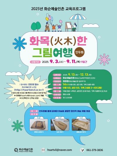 프로그램은 2025년 9월 13일부터 12월 13일까지 총 14회로 화순예술인촌 입주작가 작업실에서 아동반(초등 1~4학년), 성인반(만 20세 이상), 가족반(부 모 자녀 3~4인) 3개 과정으로 운영할 예정이다.
