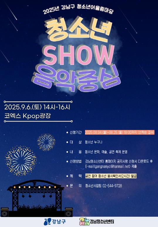 오후 2시부터 4시까지 열리는 ‘청소년 Show 음악중심’에서는 밴드, 댄스, 보컬, 치어리딩 등 다양한 장르의 청소년 공연팀이 무대에 오른다. 코엑스 K-pop광장이라는 상징적인 공간에서 펼쳐지는 공연은 청소년들이 갈고닦은 재능을 선보이며 ‘청소년이 주인공인 문화’를 전하는 의미 있는 시간이 될 전망이다.