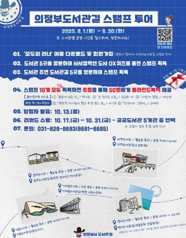 ‘의정부도서관길 스탬프 투어’는 9월 한 달간 5곳의 의정부시 공공도서관(과학․미술․음악․영어․가재울도서관)과 도서관 주변 걷기 좋은 길 5곳을 연계해 진행하는 체험형 독서문화 진흥 행사다. 누구나 자유롭게 참여할 수 있는 의정부형 스마트라이프 앱 ‘모두의 러너’를 통해 의정부도서관길을 걷고, 책을 읽으며 10개의 스탬프를 획득하는 방식으로 운영한다. 참가자 중 추첨을 통해 50명에게 책 1권과 책갈피가 담긴 블라인드북팩을 제공한다.