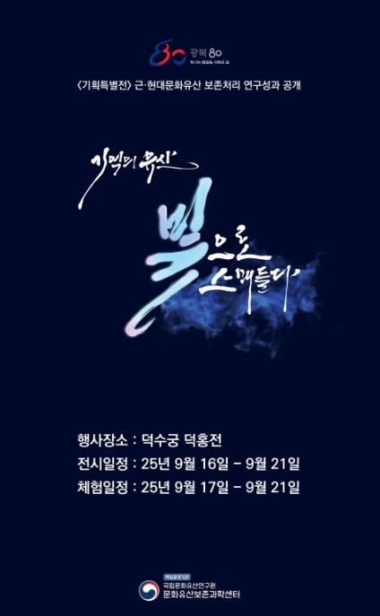 [중앙뉴스라인, 우제헌기자] 국가유산청 국립문화유산연구원 문화유산보존과학센터는 광복 80주년을 맞아 오는 9월 16일부터 21일까지 6일간 덕수궁 덕홍전(서울 중구)에서 광복과 독립운동의 상징적 유물이 보존처리를 통해 어떻게 되살아났는지 그 과정을 영상과 사진으로 조명한 기획전 '기억의 유산, 빛으로 스며들다'를 개최하고, 9월 16일 오후 2시에 개막식을 개최한다.