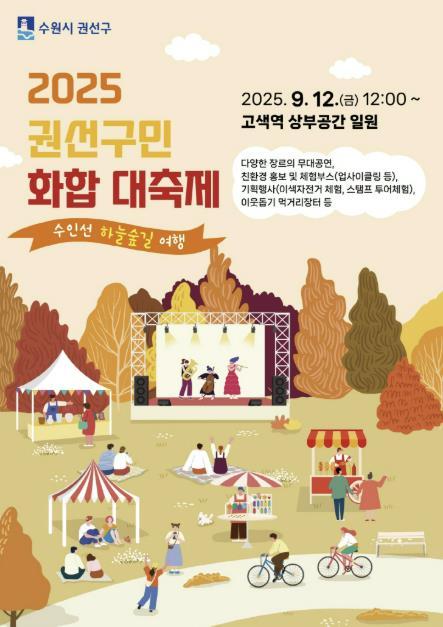[중앙뉴스라인, 우제헌기자] 수원시 권선구는 오는 12일에 '2025 권선구민 화합 대축제' ‘수인선 하늘숲길 여행’ 축제를 고색역 상부공간 일원에서 개최한다.