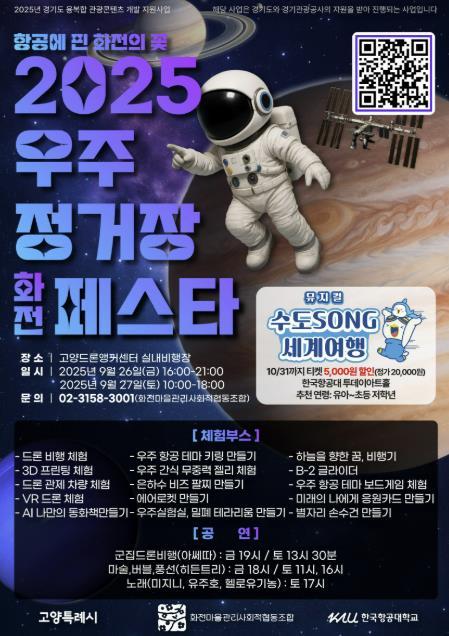 [중앙뉴스라인, 우제헌기자] 고양특례시는 한국항공대학교, 화전마을관리사회적협동조합과 공동으로 오는 26~27일 이틀간 고양드론앵커센터와 한국항공대학교 일대에서 ‘2025 우주정거장 화전 페스타'를 개최한다.