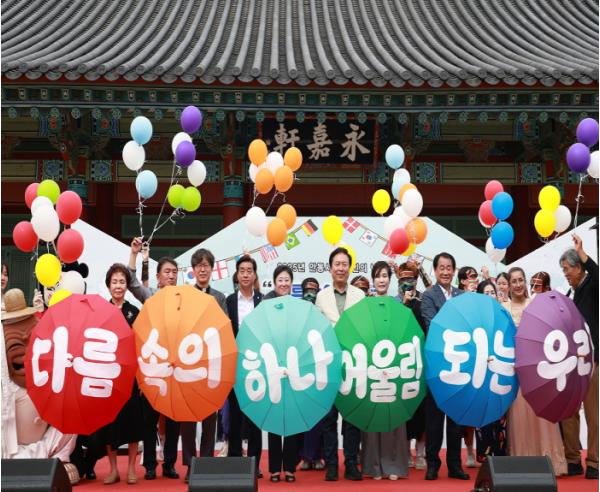 특히 퍼포먼스에서는 슬로건 공모전 최우수작인 “다름 속의 어울림, 하나 되는 우리”를 우산 캘리그래피로 제작해 선보였으며, 다문화가족과 시민이 함께 참여한 우산 퍼포먼스로 의미 있는 시간을 공유했다. 식후에는 벨리댄스와 벌룬쇼 공연이 펼쳐져 관람객들의 큰 호응을 얻었다.