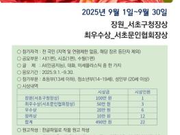 [중앙뉴스라인, 우제헌기자] 서울 서초구가 오는 9월 30일까지 ‘제11회 서초전국백일장 공모전’ 신청자를 모집한다고 밝혔다.