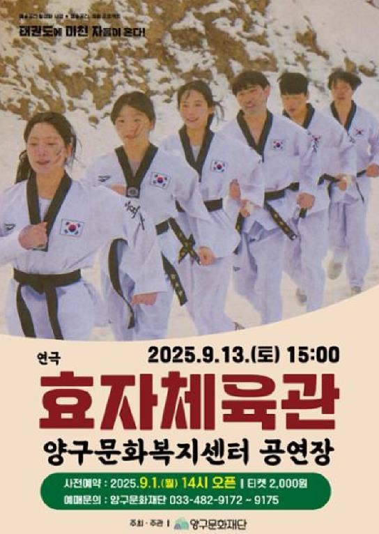 양구문화재단 관계자는 “〈효자체육관〉은 청춘의 꿈과 도전을 무대 위에 생동감 있게 담아낸 작품”이라며 “군민과 관객들이 함께 즐기고 공감하는 문화 향유의 장이 되기를 바란다”고 말했다.