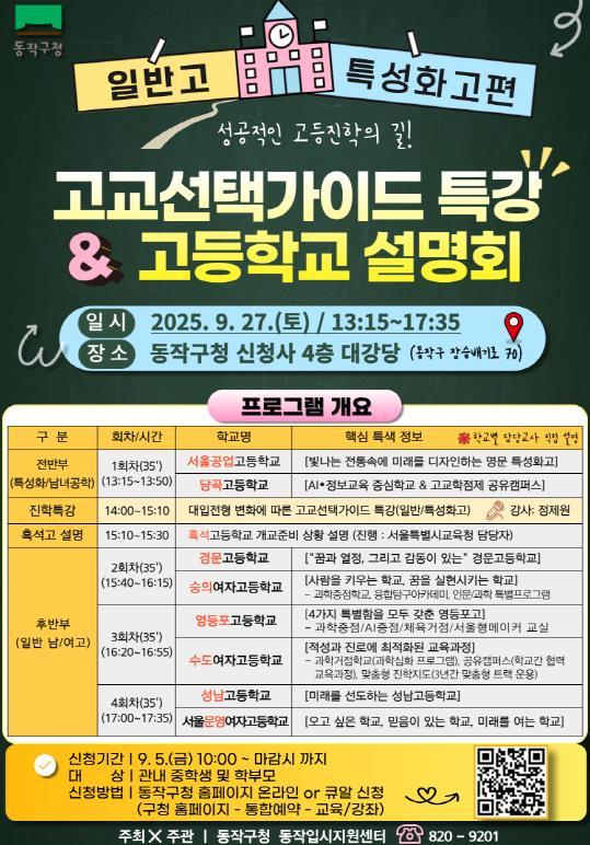 박일하 동작구청장은 “이번 설명회가 우리 학생들이 스스로 적성과 목표에 맞는 고등학교를 선택하는 데 실질적인 도움이 되길 바란다”라며 “앞으로도 맞춤형 교육 지원을 통해 청소년의 성장과 진로 탐색을 적극 뒷받침하겠다”라고 말했다.