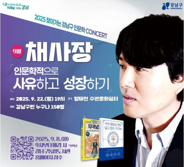 조성명 강남구청장은 “대한민국을 대표하는 지성들과 함께하는 이번 인문학 콘서트가 구민들에게 큰 울림과 영감을 주길 바란다”며, “앞으로도 책과 문화, 사람이 어우러지는 품격 있는 문화도시로서의 위상을 높여가겠다”고 밝혔다.