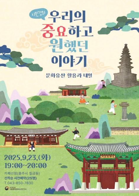 이번 하반기 시민강좌는 ‘문화유산의 활용과 내일(김재홍 한국문화유산연구센터장)’을 주제로, 현장에서 직접 문화유산 활용사업을 기획하고 수행하는 전문가를 초빙하여 이야기하고자 한다. 다양한 문화유산 활용사업의 목적과 의미를 소개하고, 충주 지역에서 즐길 수 있는 문화유산 활용 프로그램을 함께 살펴본다.