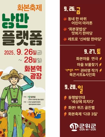 [중앙뉴스라인, 우제헌기자] 시간이 멈춘 듯한 시골 간이역, 그림 같은 풍경 속에서 올가을 가장 낭만적인 마을 축제가 펼쳐진다. 대구시 군위군 산성면 화본리, 그곳에서 오는 9월 26일부터 3일간 ‘낭만플랫폼 화본축제’가 열린다. 축제의 메인 무대는 ‘대한민국에서 가장 아름다운 간이역’으로 손꼽히는 화본역 앞 광장. 하지만 그 무대는 마을 전체다. 골목골목마다 웃음과 향수가 넘쳐나는 3일간의 특별한 시골 여행이 시작된다.