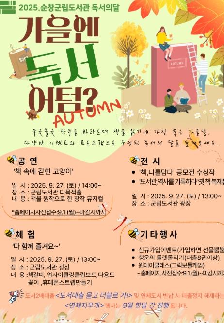 [중앙뉴스라인, 우제헌기자] 순창군은 독서의 달을 맞아 오는 27일 토요일 오후 1시부터 5시까지 순창군립도서관 광장과 다목적홀에서‘가을엔 독서 어텀(autumn)?’문화행사를 연다.