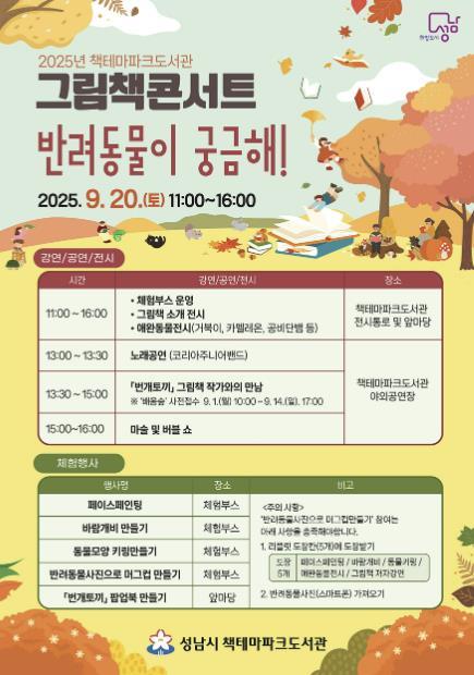 [중앙뉴스라인, 우제헌기자] 성남시는 오는 9월 20일 오전 11시~오후 4시 분당구 율동공원 내 책테마파크도서관에서 ‘반려동물이 궁금해!’ 주제로 한 그림책 콘서트를 연다.