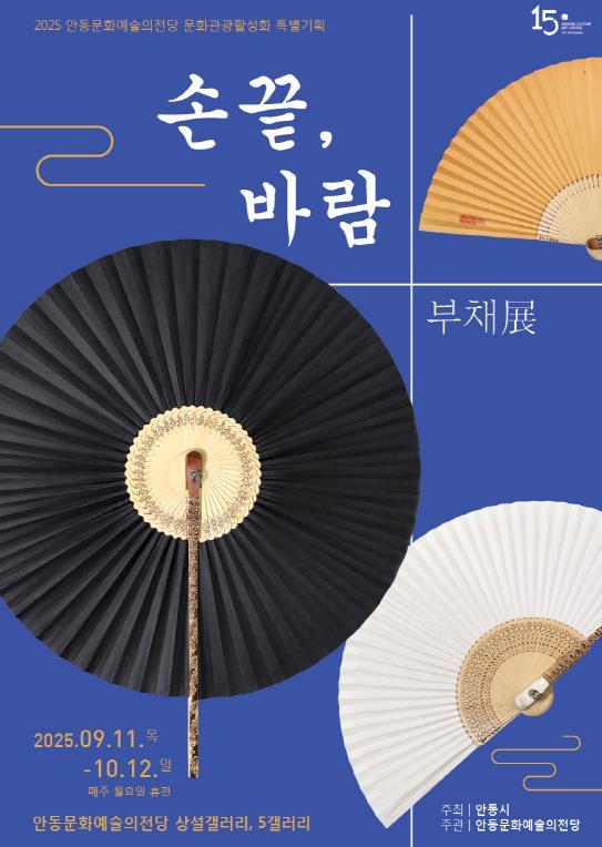 [중앙뉴스라인, 우제헌기자] 안동문화예술의전당은 한국 전통 공예의 아름다움을 담은 부채를 주제로 한 특별전 '손끝, 바람-부채展'을 2025년 9월 11일부터 10월 12일까지 상설갤러리와 5갤러리에서 개최한다. 이번 전시는 안동국제탈춤페스티벌 기간과 맞물려 관람객들에게 더욱 특별한 문화체험을 제공한다.
