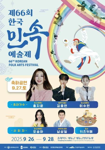 제66회 한국민속예술제가 오는 9월 26일부터 28일까지 3일간 충북 영동군민운동장에서 열리며, 오랜 역사와 전통을 계승하는 민속예술 경연과 함께 첨단 미디어 기술을 접목한 혁신적인 시도를 통해 전통의 새로운 면모를 선보일 예정이다