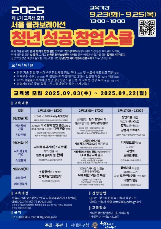 [중앙뉴스라인, 우제헌기자] 서대문구가 청년창업기업과 사회적경제기업, 예비창업자(소상공인) 등을 위해 이달 23∼25일 서대문청년창업센터(수색로 43)에서 ‘서울 콜라보레이션 청년 성공 창업스쿨’을 개최한다.