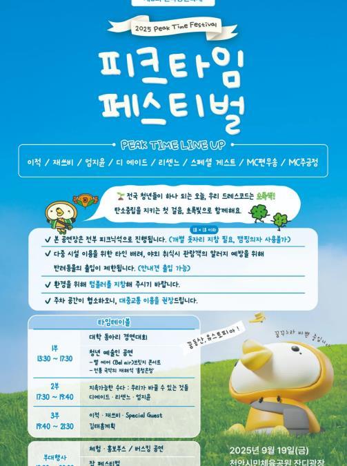 [중앙뉴스라인, 우제헌기자] 전국청년축제 ‘2025 피크타임 페스티벌’이 오는 19일 천안시민체육공원 잔디광장 일원에서 열린다.