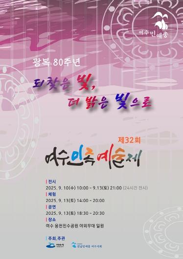 김칠선 여수지회장은 “진보적 예술정신을 바탕으로 지역 문화분권과 문화민주주의 발전을 위해 노력해 온 32년의 전통이 이번 축제를 통해 더욱 빛을 발하길 바란다”며 “특히 광복 80주년을 맞아 ‘되찾은 빛, 더 밝은 빛으로’라는 주제로 열리는 이번 예술제가 시민 모두에게 의미 있는 시간이 되기를 기대한다”고 말했다.