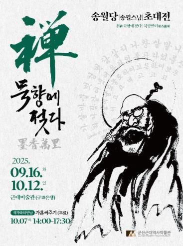 [중앙뉴스라인, 우제헌기자] 군산근대역사박물관이 9월 16일부터 10월 12일까지 근대미술관(구 18은행)에서 송월 스님 초대전『선(禪) 묵향에 젖다 – 묵향만리(墨香萬里)』를 개최한다.