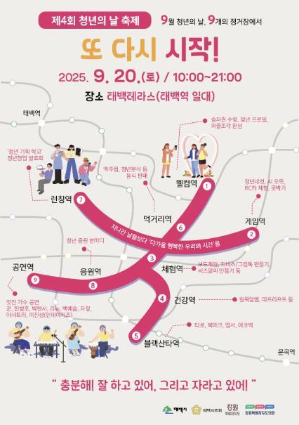 올해 주제는 “충분해! 잘하고 있어, 자라고 있어.”로, 태백시청년협의체가 직접 기획과 운영을 맡아 청년들이 주체적으로 참여하고 성장할 수 있도록 의미를 더했다. 특히 ‘9월 청년의 날, 9개의 정거장에서 또 다시 시작’이라는 테마에 맞춰 웰컴역, 런칭역 등 9개 정거장에서 다양한 체험과 프로그램이 진행된다.