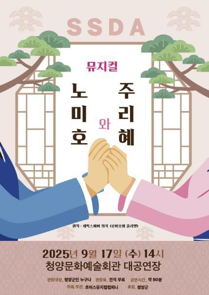 [중앙뉴스라인, 우제헌기자] 청양군이 후원하고 초이스뮤지컬컴퍼니가 주관하는 뮤지컬 ‘노미호와 주리혜’가 17일 청양문화예술회관에서 열린다. 이번 공연은 셰익스피어의 희극 중 하나인 '로미오와 줄리엣'을 조선시대를 배경으로 재창작한 작품으로 청년뮤지컬아카데미(SSDA)가 올여름 뮤지컬 캠프와 주말캠프를 통해 제작했다.
