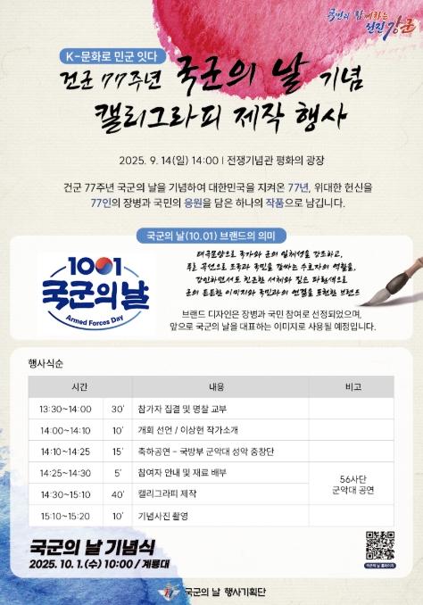 [중앙뉴스라인, 우제헌기자] 건군 77주년 국군의날 행사기획단은 9월 14일 오후 2시, 용산 전쟁기념관 평화의 광장에서 '국군의날 기념 대형 캘리그라피 제작 행사'를 개최한다고 밝혔다.