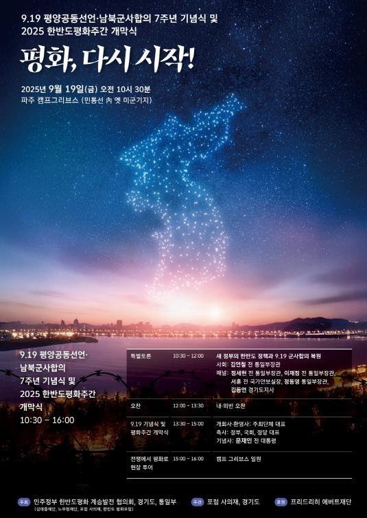 [중앙뉴스라인, 우제헌기자] 경기도와 통일부, 민주정부 한반도평화 계승발전협의회가 공동으로 주최하고 프리드리히 애버트 재단이 후원하는 ‘9.19 평양공동선언 7주년 기념행사’가 오는 19일 오전 10시 30분 파주 캠프그리브스에서 열린다.