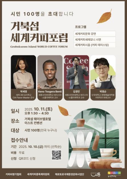 [중앙뉴스라인, 우제헌기자] ‘거북섬 세계커피포럼’이 오는 10월 11일 오후 1시 30분부터 4시 30분까지, 거북섬 웨이브엠 호텔 이스트 컨벤션에서 열린다. 이번 포럼은 전국시민 100명을 대상으로 무료로 진행되며, 선착순 신청을 통해 누구나 참여할 수 있다.