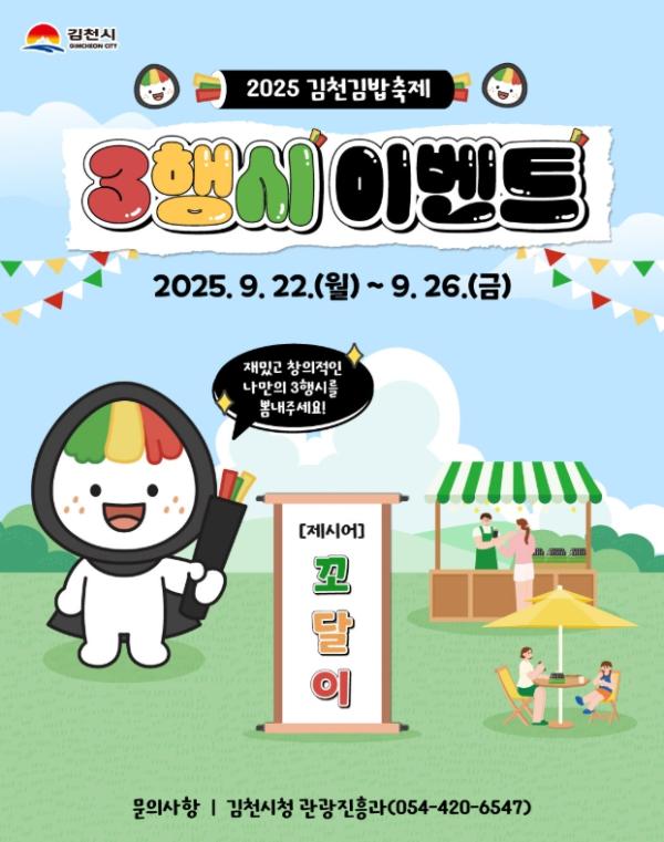 [중앙뉴스라인, 우제헌기자] 김천시는 오는 10월 25일부터 26까지 이틀간 열리는 『2025 김천김밥축제』의 분위기를 조성하고 홍보하기 위해 ‘김밥축제 캐릭터 꼬달이 삼행시 짓기 이벤트’를 개최한다.