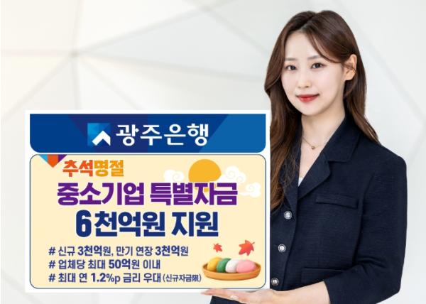 [중앙뉴스라인, 양병남기자] 광주은행은 추석 명절을 앞두고 자금 수요에 어려움을 겪는 지역 중소기업과 소상공인을 위해 총 6천억 원 규모의 ‘추석 명절 중소기업 특별자금’을 지원한다고 지난 15일 밝혔다.