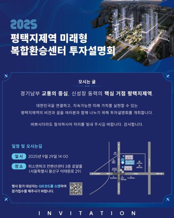 [중앙뉴스라인, 우제헌기자] 평택시는 오는 29일 14시, 서울 피스앤파크 컨벤션센터(서울시 용산구 이태원로 29) 로얄홀에서 ‘평택지제역 미래형 복합환승센터 투자설명회’를 개최한다고 밝혔다.
