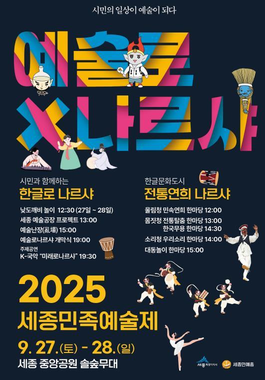 [중앙뉴스라인, 우제헌기자] 세종특별자치시가 주최하고 한국민족예술단체총연합회 세종지회가 주관하는 2025 세종민족예술제 ‘예술로 나르샤’가 오는 27∼28일 이틀간 세종중앙공원 솔숲 무대에서 펼쳐진다.