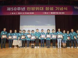 1부 기념식에서는 구청장 기념사, 50주년 기념 영상 상영, 민방위 신조 낭독 등이 이어졌다. 특히 민방위 업무 발전에 기여한 통민방위대장 15명에게 표창장을 수여해 그간의 헌신과 노고에 감사를 전했다.