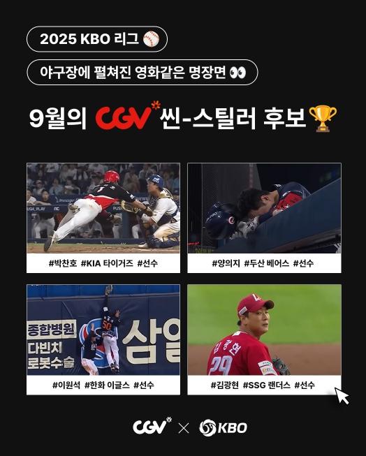 ‘9월 CGV 씬-스틸러상’ 후보 4인의 영상은 CGV 홈페이지, 모바일 앱 및 KBO, CGV 공식 인스타그램에서 확인할 수 있다.