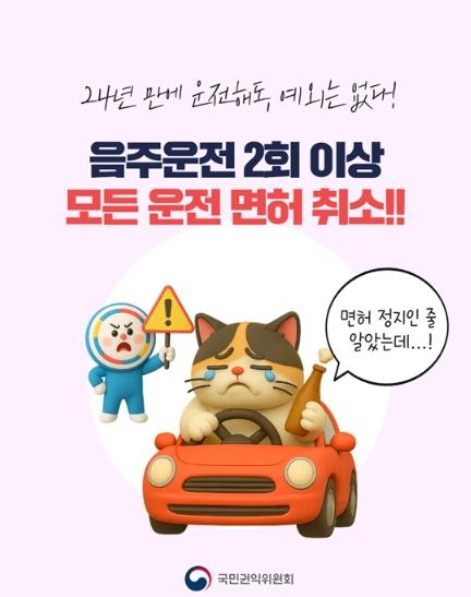 국민권익위원회, 음주운전 2회 이상 모든 운전 면허 취소!!