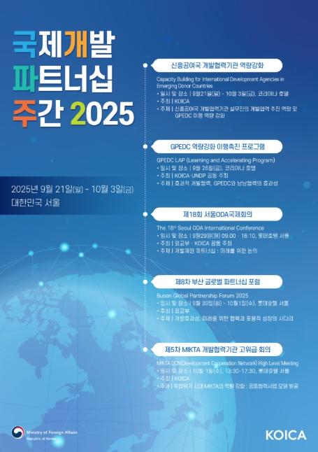 [중앙뉴스라인, 신기철기자] 외교부는 9월 21일~10월 3일 간 서울에서 한국국제협력단(KOICA)과 공동으로 '2025 국제개발 파트너십 주간'을 개최한다.
