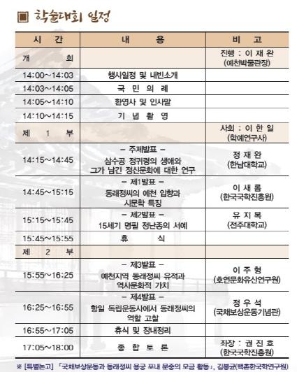 김학동 군수는 “예천지역 동래정씨는 인후경신(仁厚敬慎)이라는 가법(家法)을 이어나가며 훌륭한 인물을 많이 배출한 만큼, 이번 학술대회에 많은 지역민이 참여해 예천인의 정신과 우수한 문화를 함께 나누는 의미 있는 시간을 갖길 바란다”고 말했다.