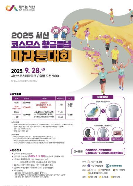 [중앙뉴스라인, 우제헌기자] 충남 서산시는 오는 28일 양대동 서산스포츠테마파크 일원에서 코스모스 황금들녘 마라톤대회를 개최한다고 밝혔다.